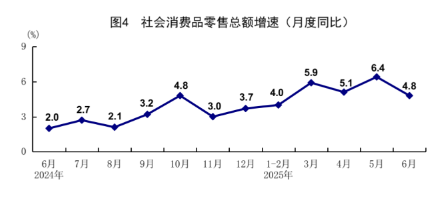 上半年,社会消费品零售总额245458亿元,同比增长5.0%,比一季度加快0.4个百分点。按经营单位所在地分,城镇消费品零售额213050亿元,同比增长5.0%;乡村消费品零售额32409亿元,增长4.9%。按消费类型分,商品零售额217978亿元,增长5.1%;餐饮收入27480亿元,增长4.3%。基本生活类和部分升级类商品销售增势较好,限额以上单位粮油食品类、体育娱乐用品类、金银珠宝类商品零售额分别增长12.3%、22.2%、11.3%。消费品以旧换新政策持续显效,限额以上单位家用电器和音像器材类、文化办公用品类、通讯器材类、家具类商品零售额分别增长30.7%、25.4%、24.1%、22.9%。全国网上零售额74295亿元,同比增长8.5%。其中,实物商品网上零售额61191亿元,增长6.0%,占社会消费品零售总额的比重为24.9%。6月份,社会消费品零售总额同比增长4.8%,环比下降0.16%。上半年,服务零售额同比增长5.3%,比一季度加快0.3个百分点。
