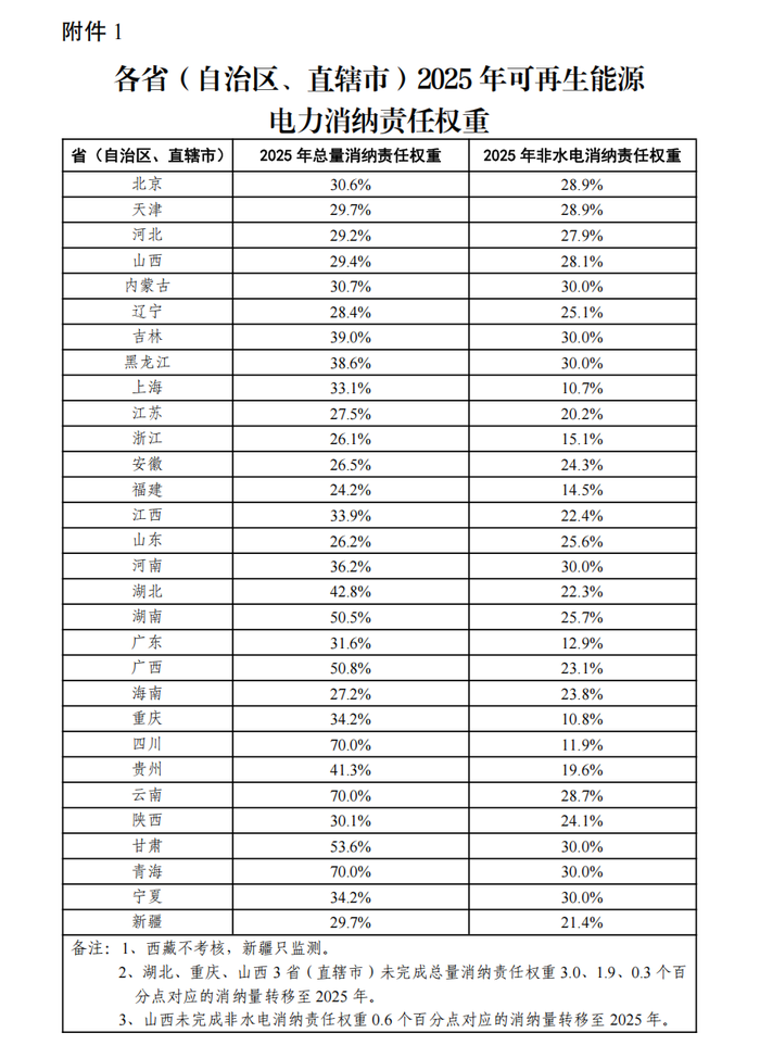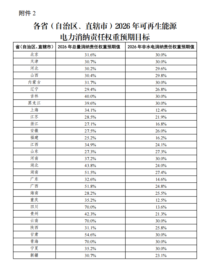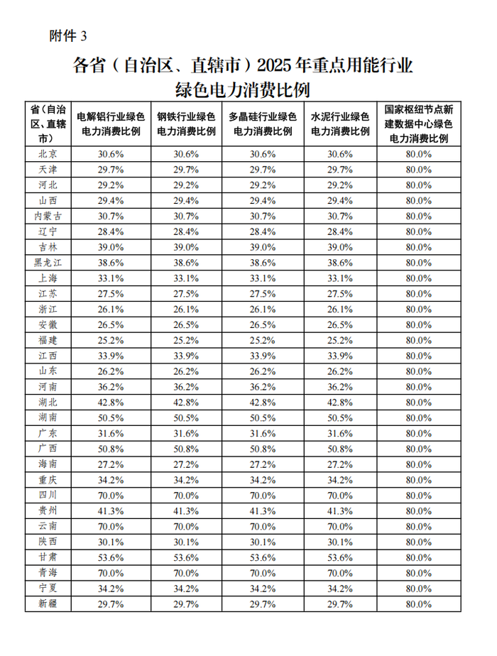 7月11日,国家发展改革委办公厅、国家能源局综合司发布关于2025年可再生能源电力消纳责任权重及有关事项的通知。通知提出,在电解铝行业基础上,2025年增设钢铁、水泥、多晶硅行业和国家枢纽节点新建数据中心绿色电力消费比例。本次下达的2025年可再生能源电力消纳责任权重为约束性指标,按此对各省(自治区、直辖市)进行考核评估;2026年权重为预期性指标,各省(自治区、直辖市)要按此做好项目储备,并结合2025年消纳责任权重完成情况优化纳入新能源可持续发展价格结算机制的电量规模,结合新能源消纳需求,同步加强调节能力规划建设等配套措施,进一步提高电力系统消纳和调控水平。
