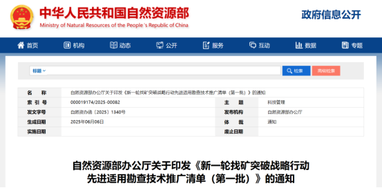 为充分发挥科技创新对矿产资源勘查工作的支撑引领作用,促进绿色先进勘查技术在新一轮找矿突破战略行动中得到广泛应用,我部组织遴选形成了《新一轮找矿突破战略行动先进适用勘查技术推广清单(第一批)》(以下简称《推广清单》)。现将《推广清单》及其应用场景印发你们,有关事宜如下:
