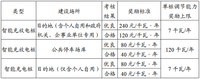(二)V2G调节能力年度奖励。对智能充(放)电桩V2G,根据电网企业调节能力考核结果(考核规则另行发布)给予奖励,奖励期3年。个人自用非智能充电桩2024年底前完成智能充电桩替代的,可获得智能充电桩奖励;2025年及以后完成智能充电桩替代的,不再奖励。具体标准详见下表。