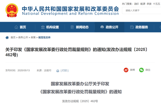 5月13日,国家发改委发布的《国家发展改革委行政处罚裁量规则》指出,国家发展改革委行使行政处罚裁量权,应当坚持公平公正、过罚相当、宽严相济、处罚与教育相结合的原则,行政处罚的种类、幅度应当与违法行为的事实、性质、情节以及社会危害程度相当。国家发改委依法对违反法律、法规、规章行为的公民、法人或者其他组织实施行政处罚,以及国家能源局、国家数据局以国家发展改革委名义实施行政处罚的,适用本规则。