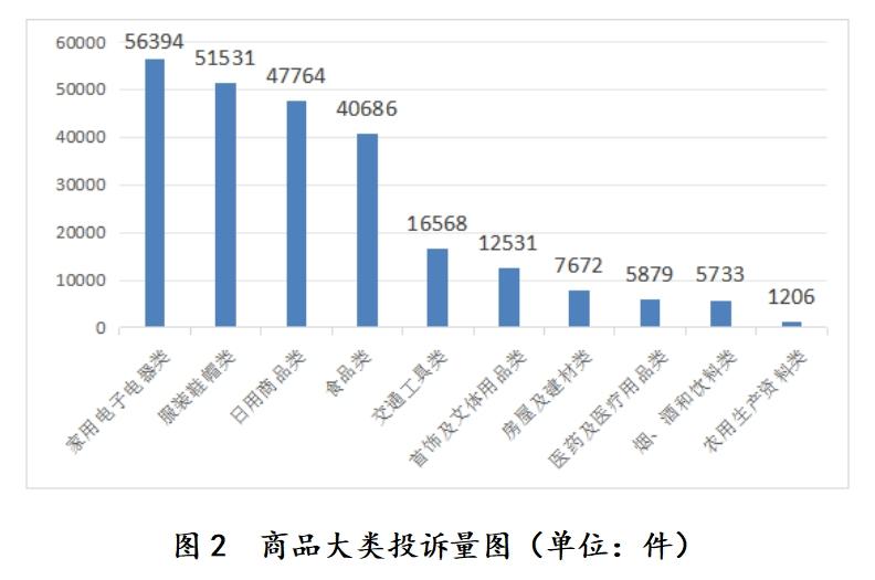 根据2025年一季度内商品大类投诉数据,家用电子电器类、服装鞋帽类、日用商品类、食品类、交通工具类投诉量居前五位。与2024年一季度相比,服装鞋帽类、日用商品类投诉量比重上升;农用生产资料类投诉量比重下降。