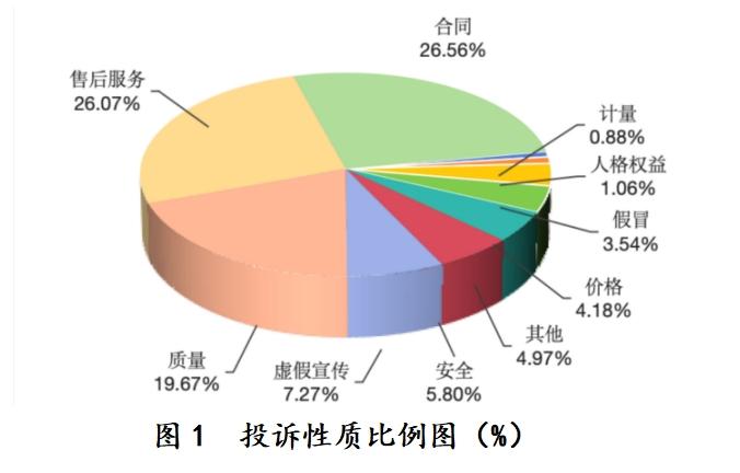 根据投诉性质,合同问题占26.56%,售后服务问题占26.07%,质量问题占19.67%,虚假宣传问题占7.27%,安全问题占5.8%,价格问题占4.18%,假冒问题占3.54%,人格权益问题占1.06%,计量问题占0.88%,其他问题占4.97%。