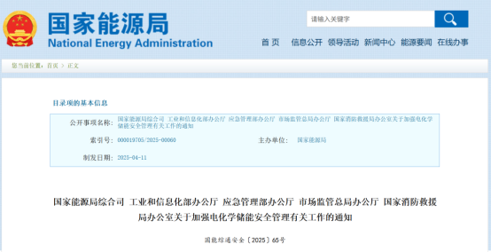 5月7日,国家能源局综合司、工业和信息化部办公厅、应急管理部办公厅、市场监管总局办公厅、国家消防救援局办公室发布的《关于加强电化学储能安全管理有关工作的通知》指出,提升电池系统本质安全水平、开展电化学储能项目安全条件和设施论证评价、进一步完善电化学储能相关标准规范、落实电化学储能项目安全监管责任、加强部门工作联动和信息共享、落实企业安全生产主体责任。