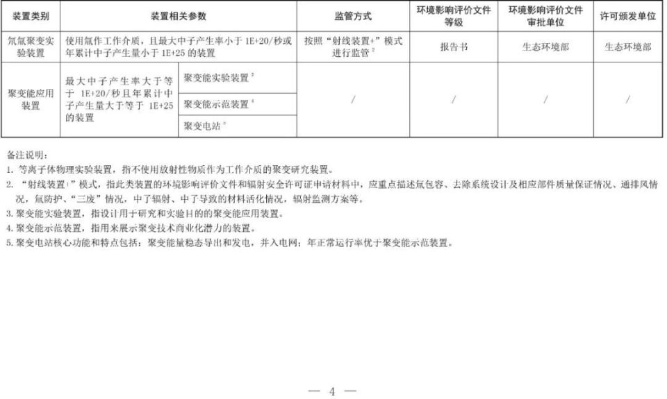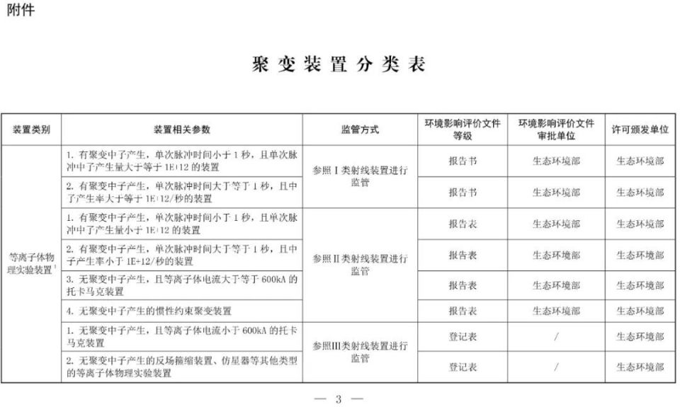 三、基于不同类型聚变装置的辐射安全风险,我部对聚变装置进行分类管理(见附件),与现行辐射管理要求有效衔接,便于建设单位根据相应的类别办理环境影响评价手续。我部将实行环境影响评价与辐射安全许可接续办理,探索开展环境影响评价与辐射安全许可“审评合一”。