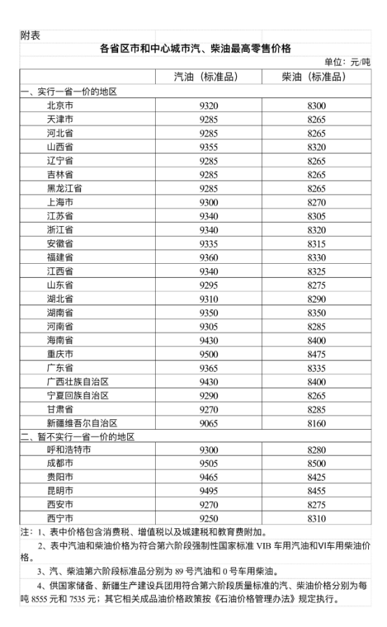 根据近期国际市场油价变化情况,按照现行成品油价格形成机制,自2025年4月2日24时起,国内汽、柴油价格(标准品,下同)每吨分别上涨230元和220元。调整后,各省(区、市)和中心城市汽、柴油最高零售价格见附表。附:各省区市和中心城市汽、柴油最高零售价格