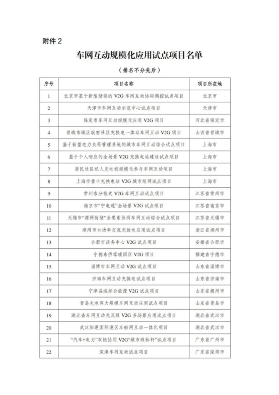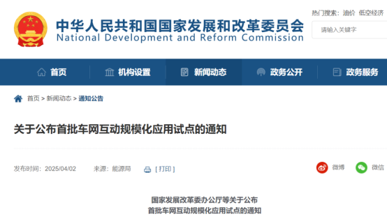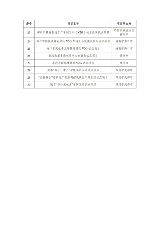 4月2日,国家发改委、国家能源局、工信部、市场监管总局联合发布的《首批车网互动规模化应用试点的通知》指出,上海市等9个城市列入首批车网互动规模化应用试点城市,“北京市基于新型储能的V2G车网互动协同调控试点项目”等30个项目列入车网互动规模化应用试点项目。