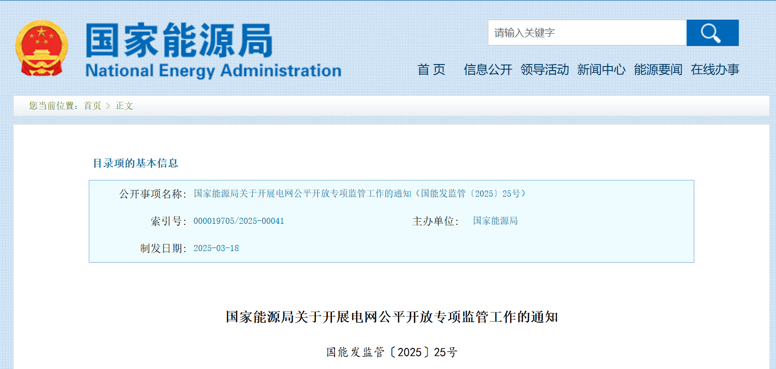 为深入贯彻党的二十届三中全会精神,落实党中央、国务院关于加强能源行业自然垄断环节监管的决策部署,全面贯彻实施能源法,规范电网设施公平开放行为,提升电网企业接入和服务水平,根据《电网公平开放监管办法》(国能发监管规〔2021〕49号)、《2025年能源监管重点任务清单》(国能发监管〔2025〕4号),国家能源局决定在江苏、陕西等19个省(区、市)开展电网公平开放专项监管工作。现将有关事项通知如下。