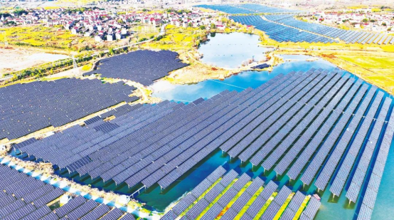 ▲江西省丰城市,连片的光伏发电板依次排列,熠熠生辉,与周边乡村美景、田园风光相互映衬。图片来源:视觉中国