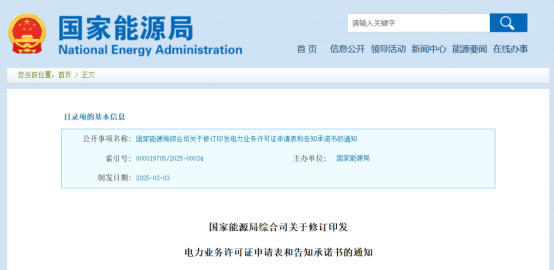 国家能源局网站3月13日消息,国家能源局对电力业务许可证申请表、告知承诺书(发电类、输电类、供电类——一般供电公司用、供电类——增量配电企业用)等格式文本进行了修订并印发。