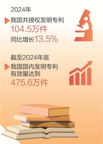 国家知识产权局数据显示:2024年,我国共授权发明专利104.5万件,同比增长13.5%。截至2024年底,我国国内发明专利有效量达到475.6万件,成为世界上首个突破400万件的国家。