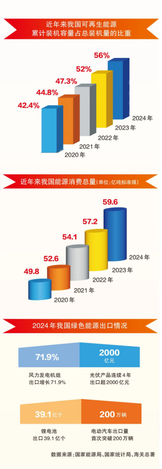 放眼全国,截至2024年底,全国可再生能源装机达到18.89亿千瓦,同比增长25%,约占我国总装机的56%。同期,可再生能源发电量稳步提升。2024年,全国可再生能源发电量达3.46万亿千瓦时,同比增加19%,约占全部发电量的35%;其中,风电太阳能发电量合计达1.83万亿千瓦时,同比增长27%,与同期第三产业用电量基本持平,远超同期城乡居民生活用电量。