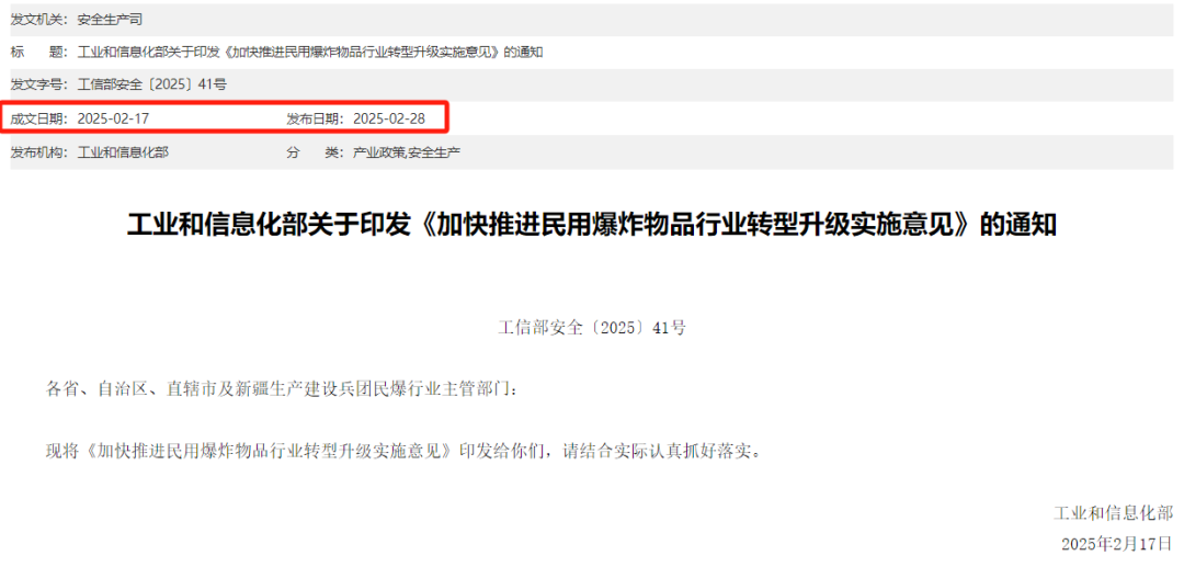 2月28日,工业和信息化部发布了关于印发《加快推进民用爆炸物品行业转型升级实施意见》(以下简称《实施意见》)的通知。