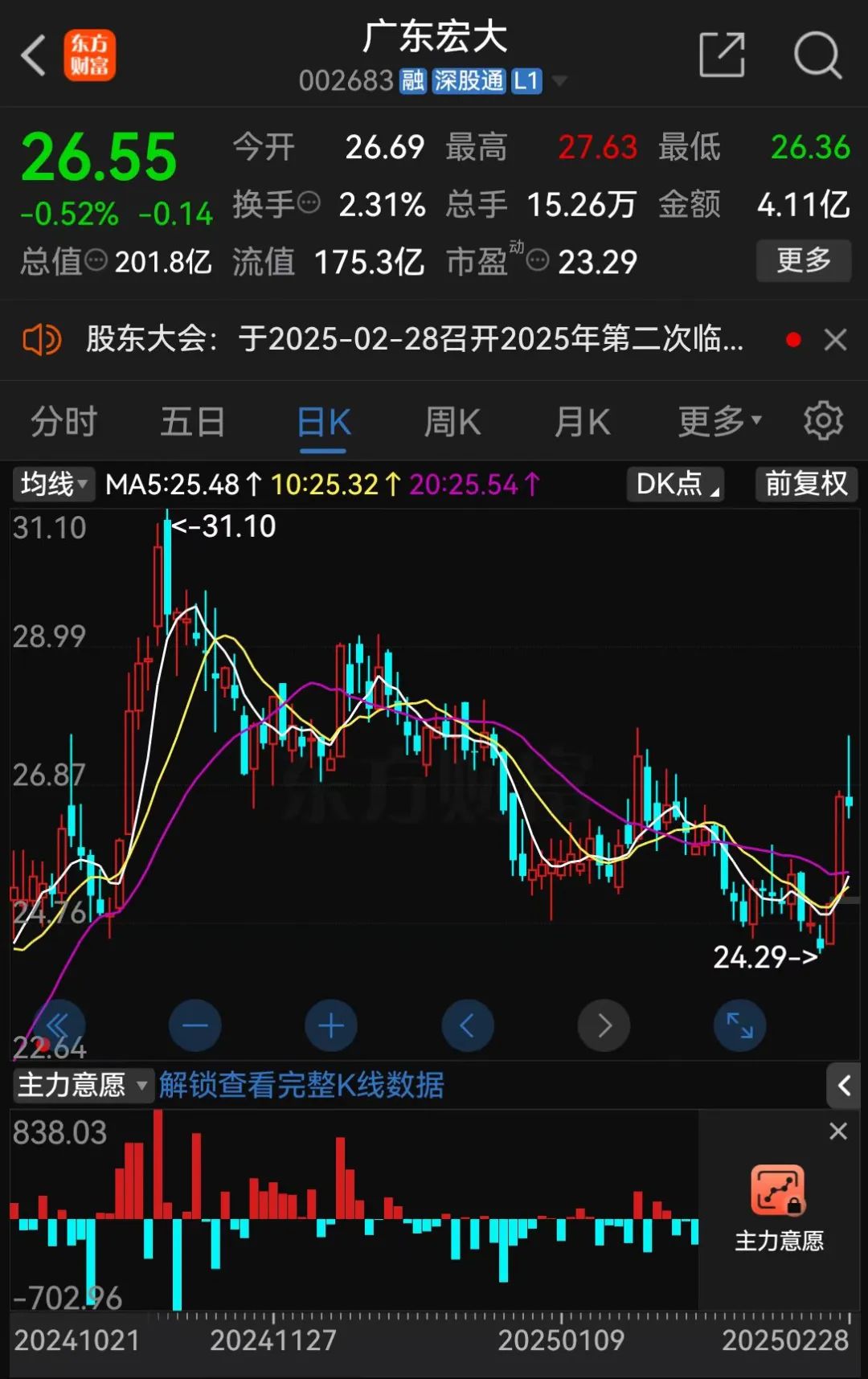 截至2月28日收盘,广东宏大股价报26.55元/股,跌幅达0.52%,总市值为201.8亿元。