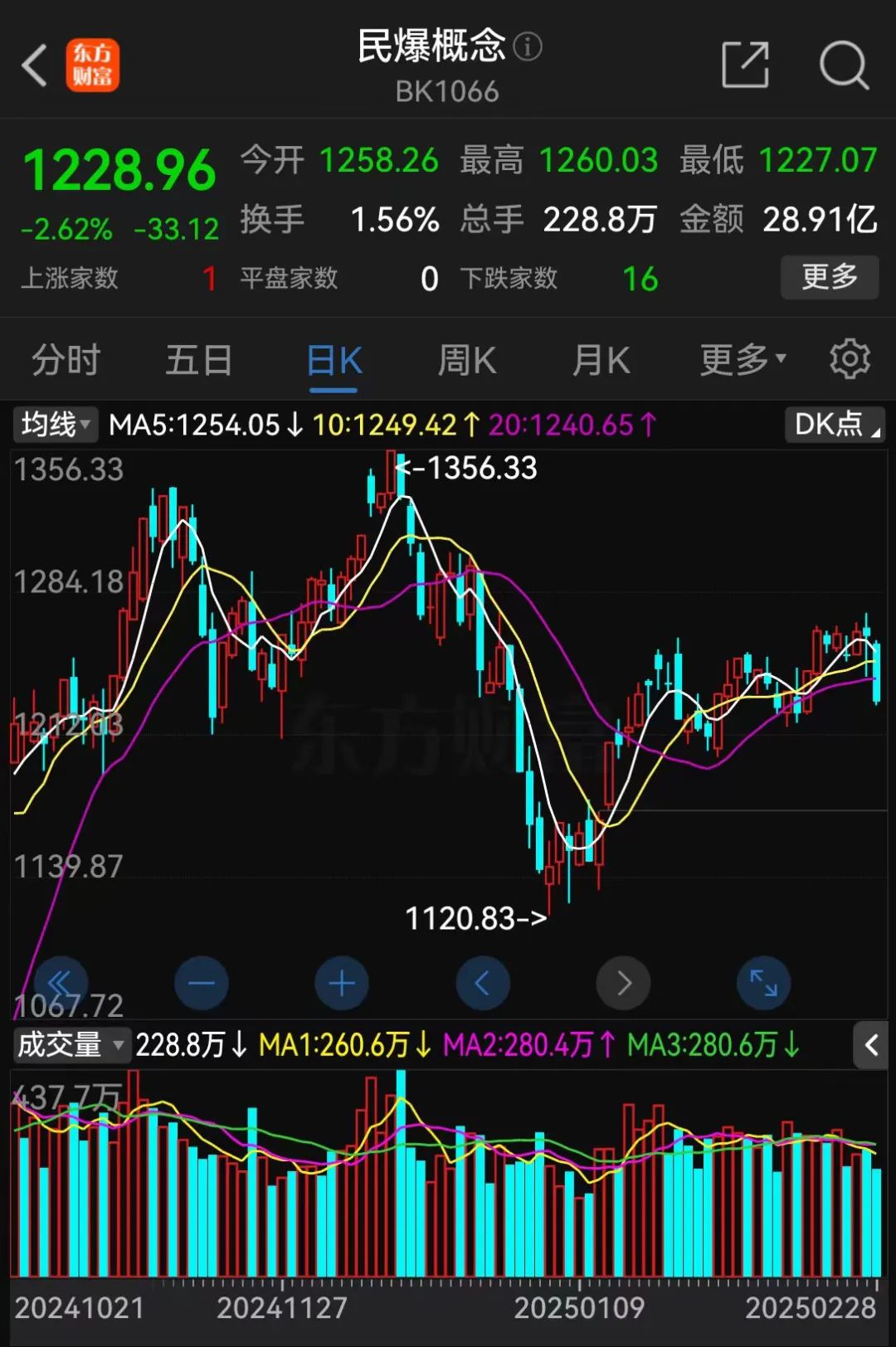 目前,A股共有17只民爆概念股。截至2月28日收盘,民爆概念指数报1228.96点,跌幅达2.62%。
