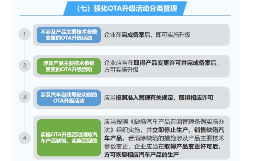 强化OTA升级活动分类管理。不涉及产品主要技术参数变更的OTA升级活动,企业在完成备案后,即可实施升级;涉及产品主要技术参数变更的,企业应当在取得产品变更许可并完成备案后,方可实施升级。涉及汽车自动驾驶功能的OTA升级活动,应当按照准入管理有关规定,取得相应许可。