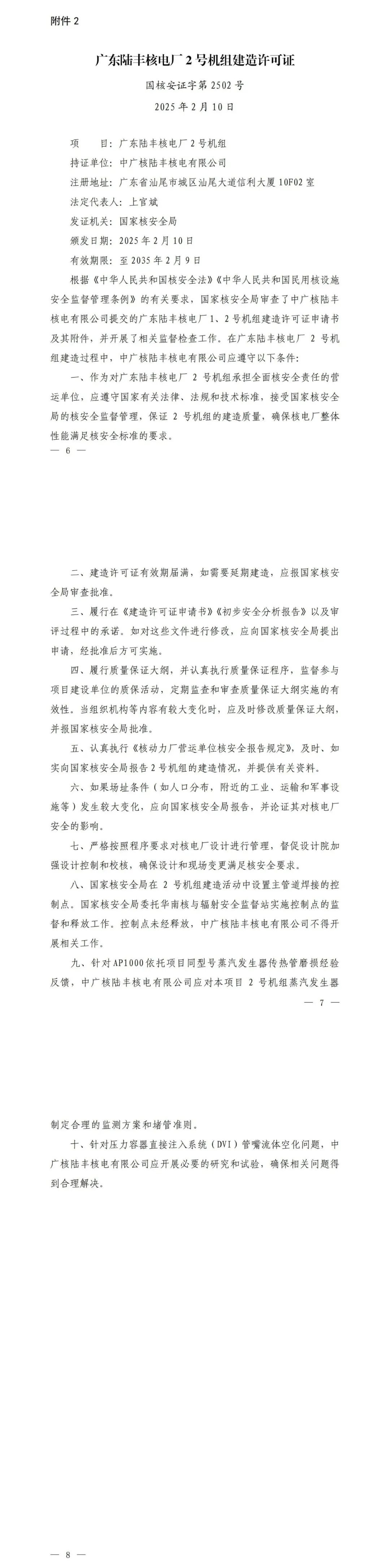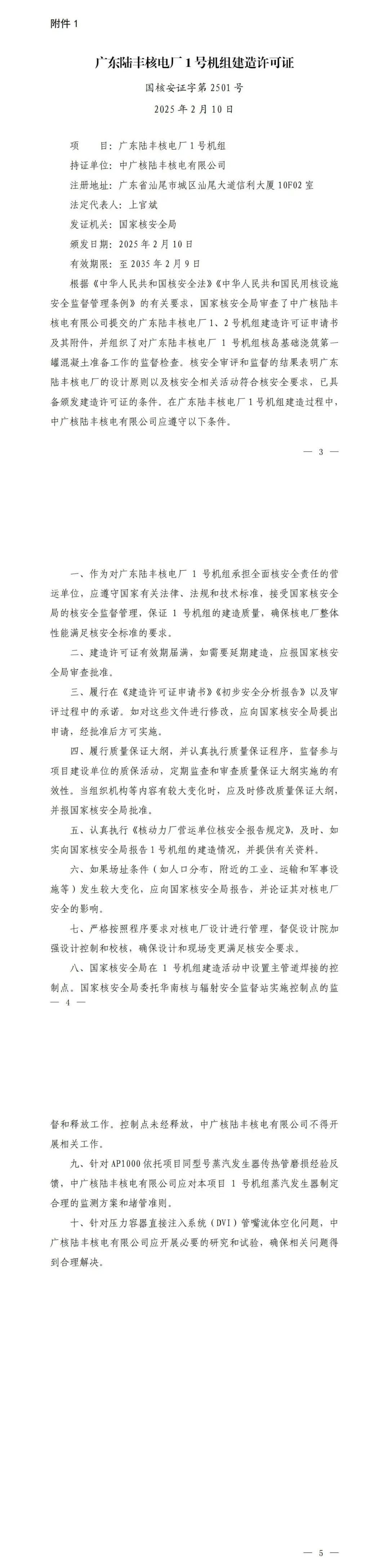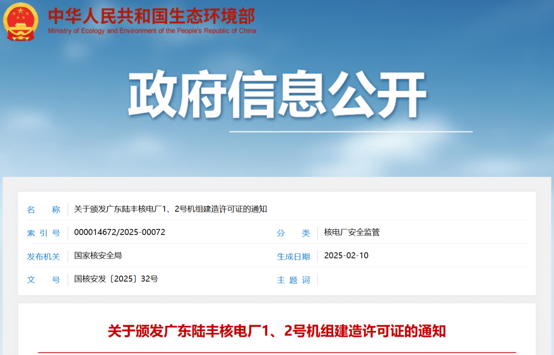 据生态环境部网站2月10日消息,近日,国家核安全局颁发广东陆丰核电厂1、2号机组建造许可证。经审查,国家核安全局认为广东陆丰核电厂1、2号机组的设计原则以及核安全相关活动满足我国核安全法规的要求,决定颁发《广东陆丰核电厂1号机组建造许可证》和《广东陆丰核电厂2号机组建造许可证》。