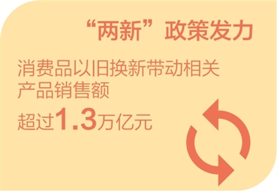 商务部新闻发言人何咏前:中央经济工作会议提出,大力提振消费。初步统计,2024年,全国汽车以旧换新超过680万辆,超3600万名消费者购买8大类家电以旧换新产品超过5600万台,家装厨卫“焕新”补贴产品约6000万件,电动自行车以旧换新超过138万辆。消费品以旧换新带动相关产品销售额超过1.3万亿元。