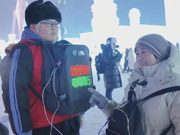 ▲游客正在冰雪大世界体验“暖心电宝”服务。王昱心/摄