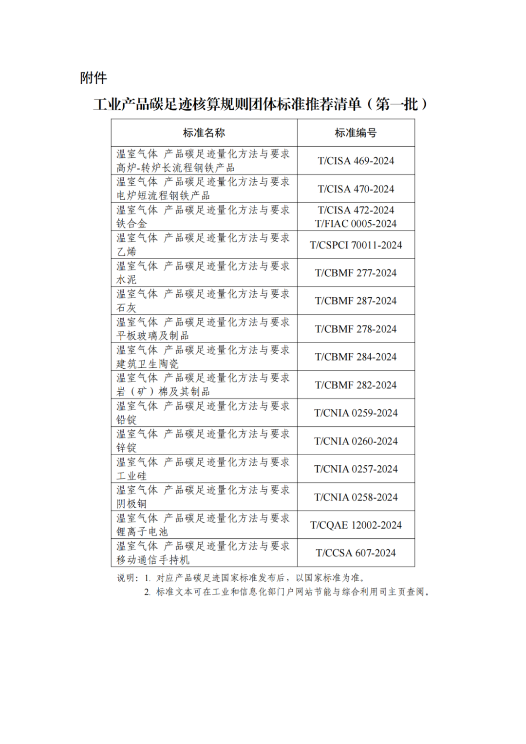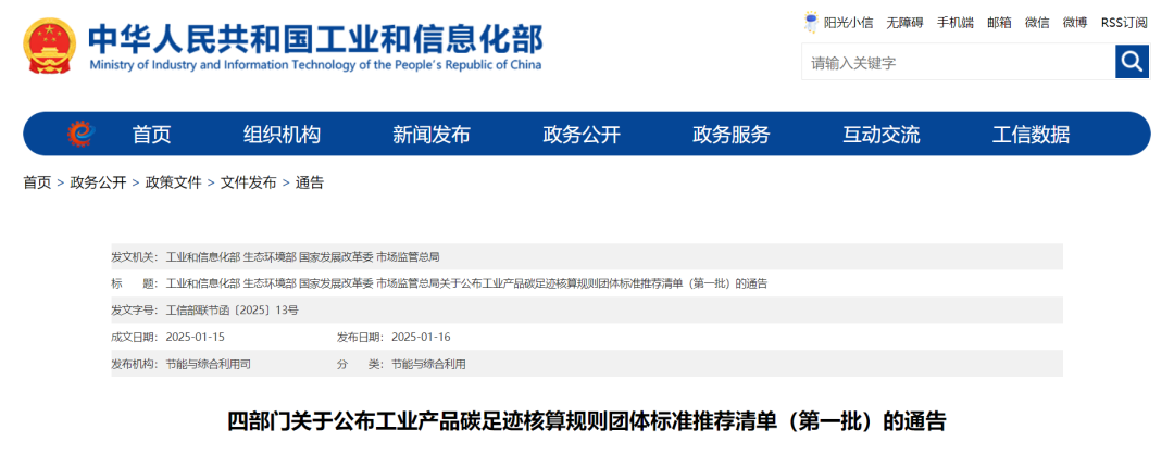 工业和信息化部 生态环境部 国家发展改革委 市场监管总局关于公布工业产品碳足迹核算规则团体标准推荐清单(第一批)的通告工信部联节函〔2025〕13号为加快提升工业产品碳足迹管理水平,建立健全碳足迹管理体系,促进工业绿色低碳转型,经相关标准化机构推荐、专家评审、网上公示等程序,工业和信息化部、生态环境部、国家发展改革委、市场监管总局确定了15项工业产品碳足迹核算规则团体标准推荐清单(第一批),现予以公布。特此通告。附件:工业产品碳足迹核算规则团体标准推荐清单(第一批)