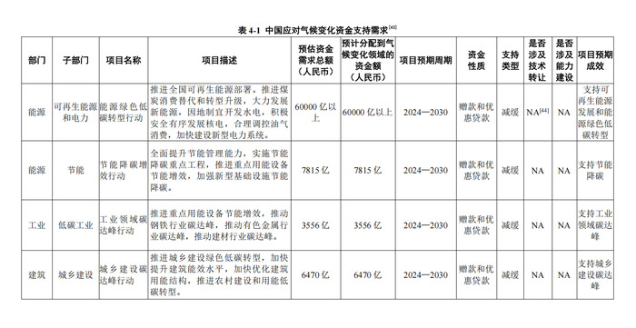 2023年12月提交的《中华人民共和国气候变化第四次国家信息通报》指出,中国2021-2030年减缓行动的年均资金需求规模约2万亿元;为实现碳中和目标,中国进一步强化减缓行动,2021-2060年减缓行动的年均资金需求规模约6.5万亿元;2021-2060年适应气候变化资金年均需求1.6万亿元。