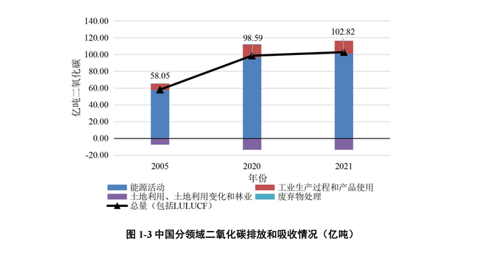 在不包括土地利用、土地利用变化和林业的情况下,2021年中国温室气体排放总量约为143.14亿吨二氧化碳当量,同比增长4%,主要是由于能源活动、工业生产过程和产品使用领域温室气体排放总量上升导致。