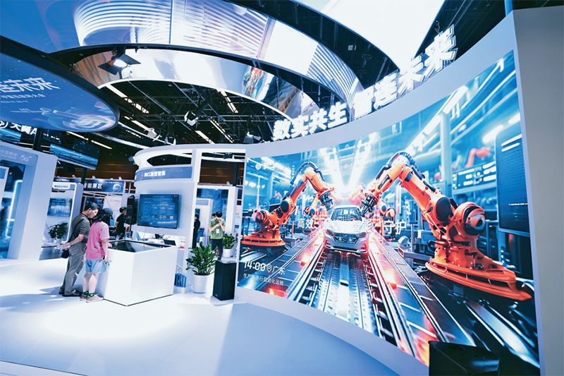 2024年7月9日,由中国互联网协会主办的2024中国互联网大会在北京国家会议中心开幕,大会以“互联三十载 智汇新质变”为主题,聚焦人工智能、工业互联网、数据要素、算力等热点。图为7月10日,参观者在大会上参观中国移动展区。 中新社发 陈晓根/摄