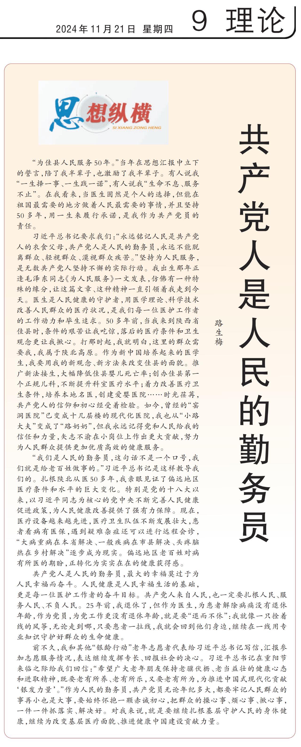 今天,《人民日报》理论版“思想纵横”栏目刊发路生梅署名文章《共产党人是人民的勤务员》,人民日报社理论部“言之有理”工作室联合《环球人物》杂志社推出《窑洞医生路生梅——北京姑娘在陕北的56年》短视频,以飨读者。