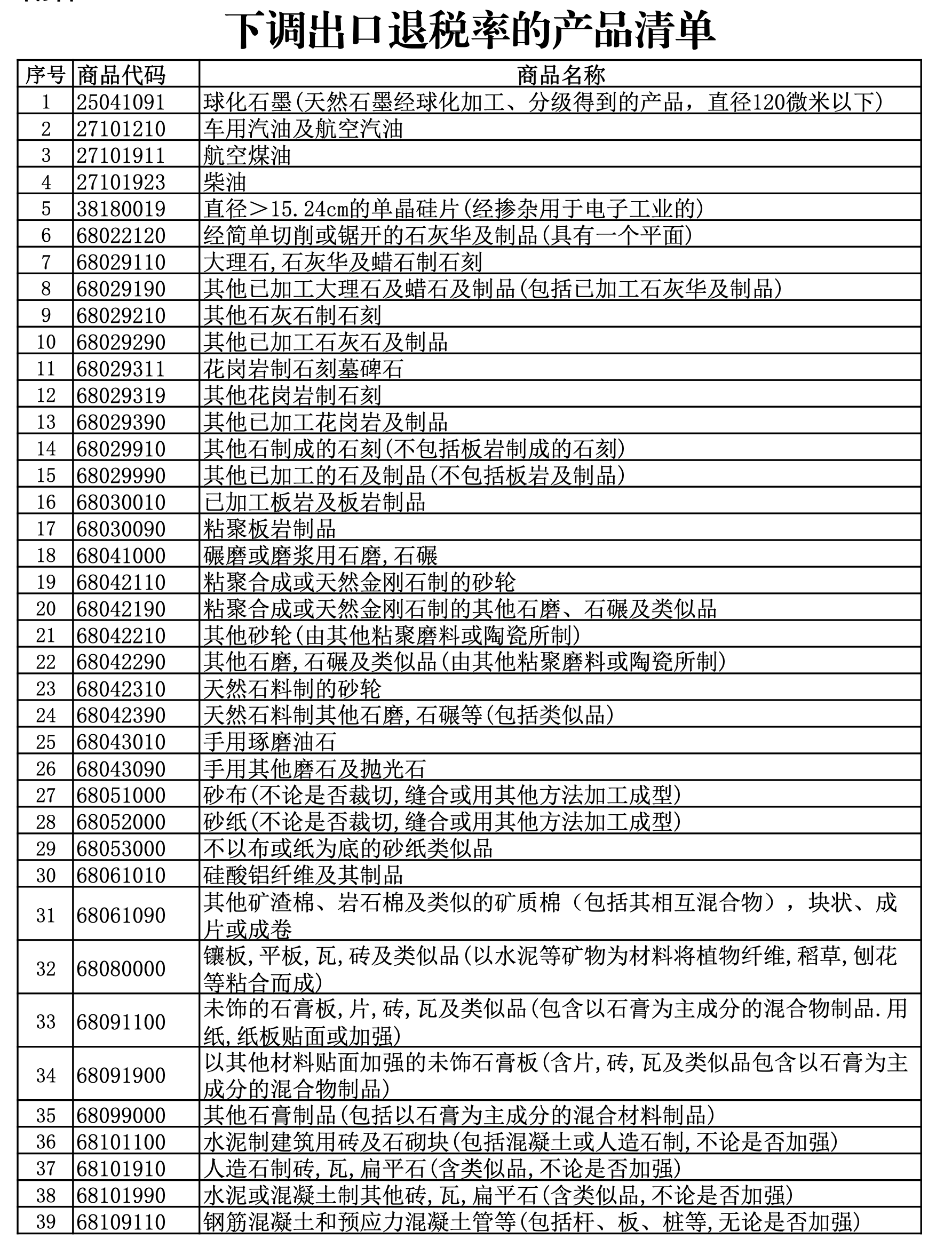 11月15日,财政部、国家税务总局发布关于调整出口退税政策的公告,其中,取消铝材、铜材以及化学改性的动、植物或微生物油、脂等产品出口退税,将部分成品油、光伏、电池、部分非金属矿物制品的出口退税率由13%下调至9%。