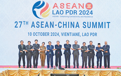 本报万象10月10日电(记者陈尚文、杨一)当地时间10月10日,国务院总理李强在老挝万象出席第27次中国—东盟(10+1)领导人会议。东盟轮值主席国老挝总理宋赛、文莱苏丹哈桑纳尔、柬埔寨首相洪玛奈、印尼副总统马鲁夫、马来西亚总理安瓦尔、菲律宾总统马科斯、新加坡总理黄循财、泰国总理佩通坦、越南总理范明政、缅甸外交部常秘昂觉莫、东盟观察员东帝汶总理夏纳纳与会。东盟秘书长高金洪出席。