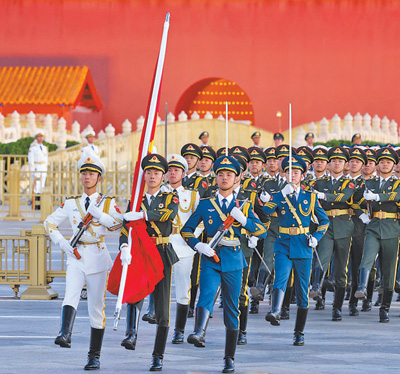 清晨6时许,国旗护卫队从天安门走出,跨过长安街,昂首阔步走向升旗台。“向国旗——敬礼!”伴随着雄壮的《义勇军进行曲》,五星红旗冉冉升至旗杆顶端。人群发出阵阵欢呼:“祝福祖国!”“祖国万岁!”