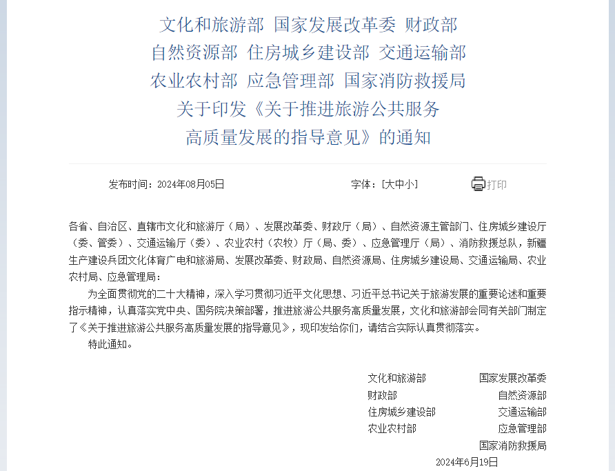 据文旅部网站消息,文化和旅游部、国家发展改革委、财政部、自然资源部、住房城乡建设部、交通运输部、农业农村部、应急管理部、国家消防救援局等九部门近日印发《关于推进旅游公共服务高质量发展的指导意见》。