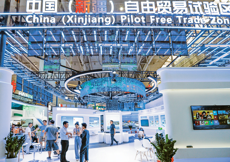 建设自由贸易试验区是新时代推进改革开放的重要战略举措,在我国改革开放进程中具有里程碑意义。10多年来,我国自由贸易试验区持续加强制度集成创新,以开放促改革、促发展。图为2024年6月25日,在第八届中国—亚欧博览会拍摄的中国(新疆)自由贸易试验区展台。 新华社记者 陈朔/摄