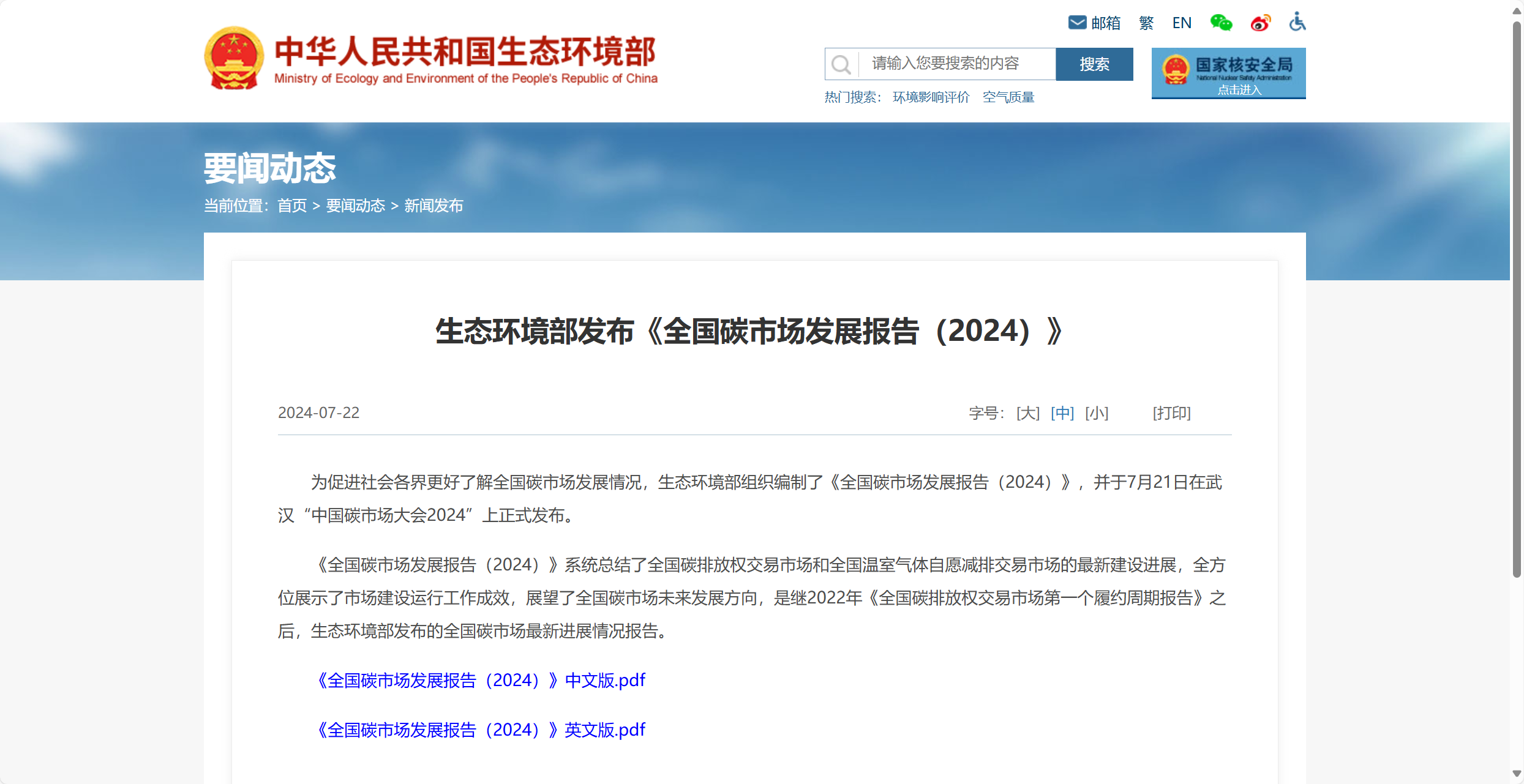 为促进社会各界更好了解全国碳市场发展情况,生态环境部组织编制了《全国碳市场发展报告(2024)》,并于7月21日在武汉“中国碳市场大会2024”上正式发布。