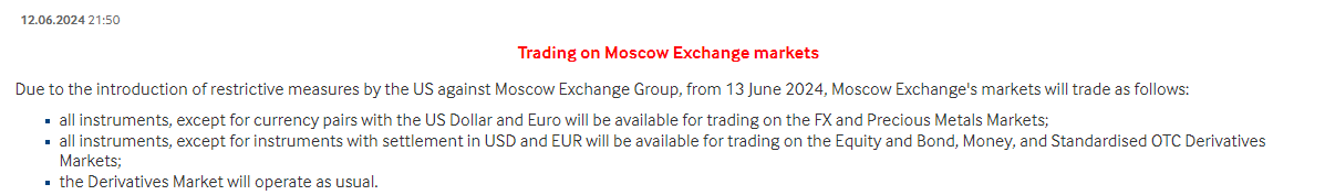 此外,在股票市场、货币市场和标准化衍生金融工具市场中也将不再交易以美元和欧元进行结算的金融工具。公告补充称,远期市场交易不受影响。