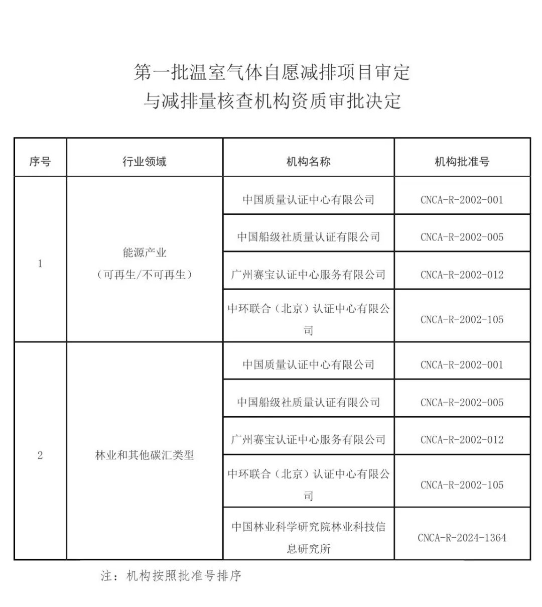 根据《中华人民共和国认证认可条例》《温室气体自愿减排交易管理办法(试行)》《认证机构管理办法》,经商生态环境部,现发布第一批温室气体自愿减排项目审定与减排量核查机构资质审批决定。