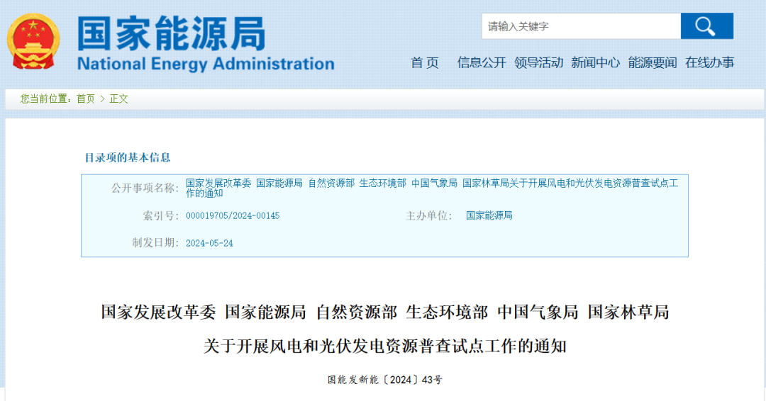 6月6日,国家发改委、国家能源局、自然资源部、生态环境部、中国气象局、国家林草局发布的《关于开展风电和光伏发电资源普查试点工作的通知》指出,按照普查基础良好、对象覆盖全面、具有区域典型性的原则,选择河北、内蒙古、上海、浙江、西藏、青海等6个省(自治区、直辖市)作为试点地区,以县域为单元,开展风电和光伏发电资源普查试点工作。