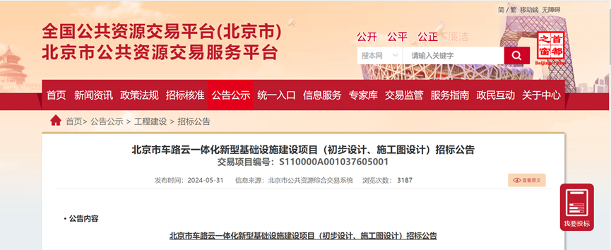 日前,北京市公共资源交易服务平台正式发布了《北京市车路云一体化新型基础设施建设项目(初步设计、施工图设计)招标公告》。
