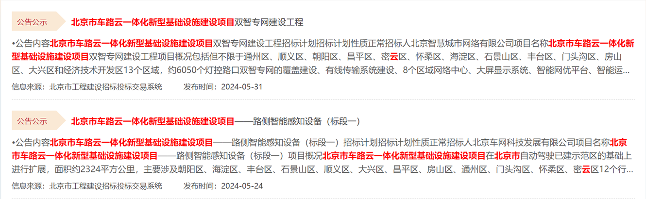 除了总招标公告之外,北京市公共资源交易服务平台还分别在5月24日及31日分别发布了该项目的“双智专网建设工程”与“路侧智能感知设备(标段一)”公告。