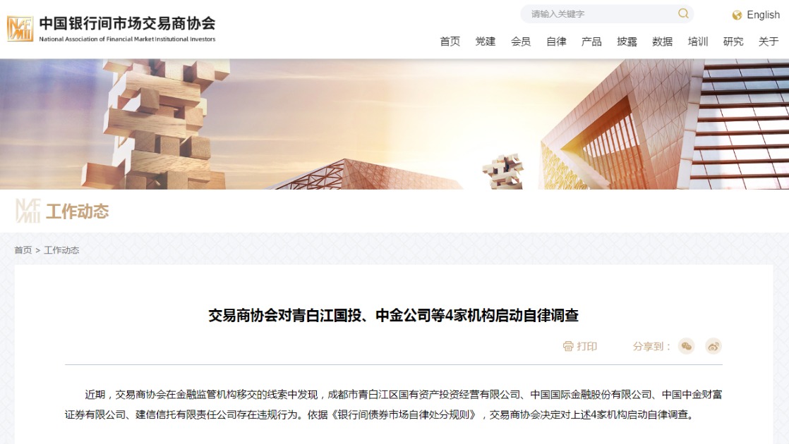 近期,交易商协会在金融监管机构移交的线索中发现,成都市青白江区国有资产投资经营有限公司、中国国际金融股份有限公司、中国中金财富证券有限公司、建信信托有限责任公司存在违规行为。依据《银行间债券市场自律处分规则》,交易商协会决定对上述4家机构启动自律调查。