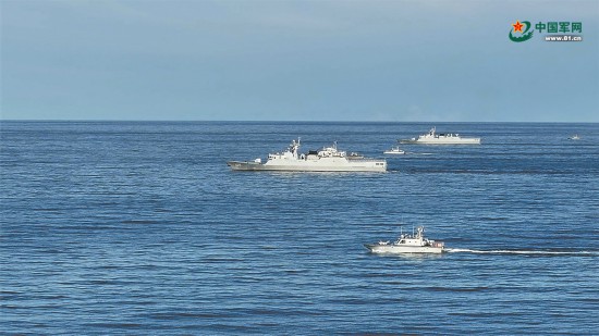 演练期间,中柬海军舰船联合编队向目标海域航行。王兆祺 摄