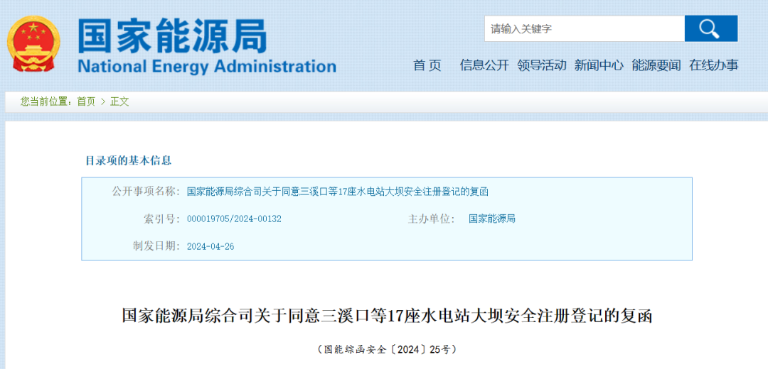 5月14日,国家能源局综合司发布的《关于同意三溪口等17座水电站大坝安全注册登记的复函》指出,同意福建周宁上库坝、周宁下库坝,湖北江坪河等3座大坝首次安全注册,注册登记等级为甲级;同意浙江三溪口,重庆盖下坝,四川汉阳、千佛岩、瓦屋山、水津关、周公河沙坪,贵州黄花寨、冗各、上尖坡、团坡、灰洞、双河口,云南糯租等14座水电站大坝换证安全注册,注册登记等级为甲级。