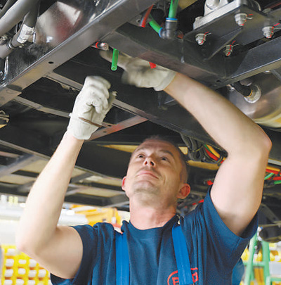 初夏时节,多瑙河畔绿意盎然。在比亚迪匈牙利电动大巴工厂的合装车间,车间主任阿尔盖·伊姆雷正在和工人们一起组装大巴,这几辆大巴订单分别来自德国和希腊。“我们的电动大巴性能优异,充电两小时就可续航400公里,很受市场欢迎。”伊姆雷说。