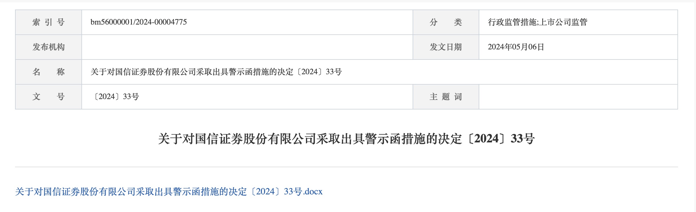 5月6日,广东证监局发布公告,关于对国信证券(002736.SZ)采取出具警示函措施的决定。