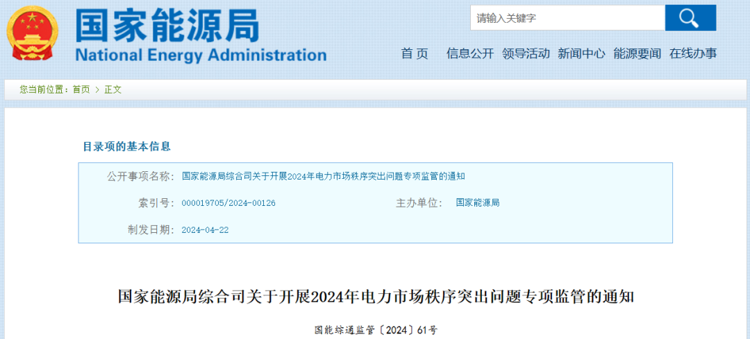 国家能源局综合司关于开展2024年电力市场秩序突出问题专项监管的通知