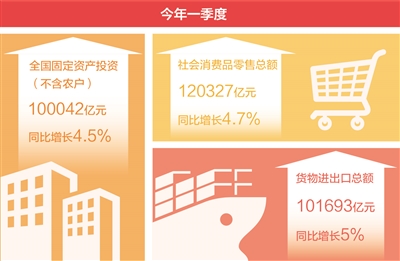 二是有支撑。一季度,全国固定资产投资(不含农户)同比增长4.5%,扣除价格因素影响,实际增长5.9%;社会消费品零售总额同比增长4.7%;出口增长4.9%。从需求核算角度看,投资、消费、出口三大需求指标与GDP增长相匹配。
