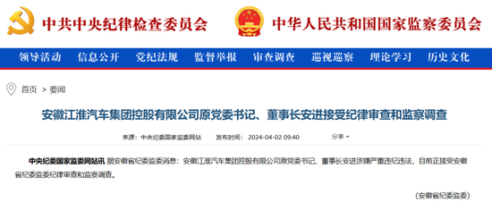 4月2日,安徽省纪委监委消息显示,安徽江淮汽车集团控股有限公司原党委书记、董事长安进涉嫌严重违纪违法,目前正接受安徽省纪委监委纪律审查和监察调查。
