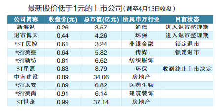 数据显示,截至4月12日收盘,已有10只A股股价低于1元,其中新海退、退市博天已进入退市整理期,即将面临摘牌。ST星源已经收到交易所拟决定终止公司股票上市交易的事先告知书,另有多只股票于近日陆续跌破1元,“面值退市”风险加剧。