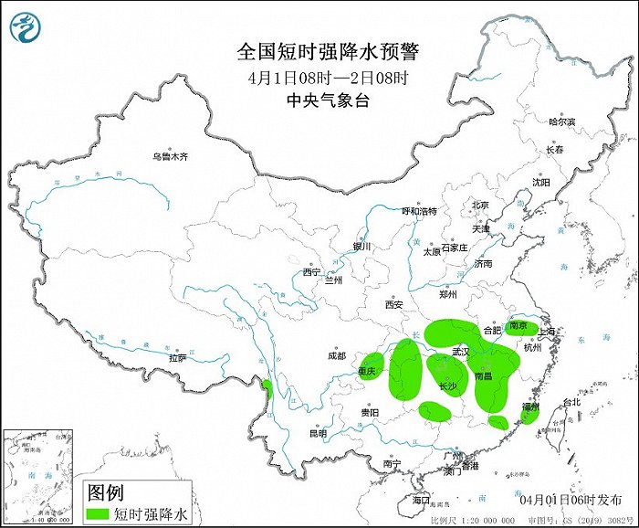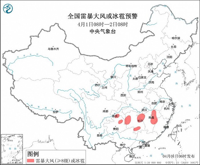 预计4月1日08时至2日08时,湖南北部和东南部、江西中北部、重庆南部、贵州东北部等地的部分地区将有8-10级雷暴大风或冰雹天气;河南南部、安徽南部、江苏南部、湖北中东部和南部、湖南中北部、江西中东部和西北部、浙江西部、福建东南部和西部、重庆南部和东北部、贵州东北部、云南西北部、广西东北部等地的部分地区将有短时强降水天气,最大小时雨量30-50毫米,局地可达70毫米以上。