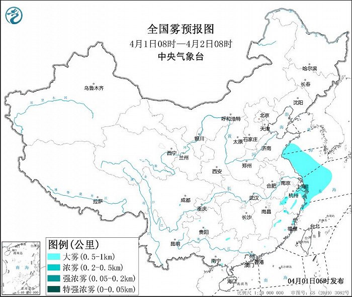 预计,4月1日白天至夜间,黄海中西部和南部海域、东海西北部海域、杭州湾附近海域、长江口附近海域、舟山群岛附近海域、山东半岛南部沿岸海域、江苏沿岸海域、浙江沿岸海域将有能见度不足1公里的大雾。此外,4月1日早晨至上午,浙江中北部、福建西北部等地的部分地区有能见度不足1公里的大雾,其中,浙江北部局地有能见度不足200米的强浓雾。
